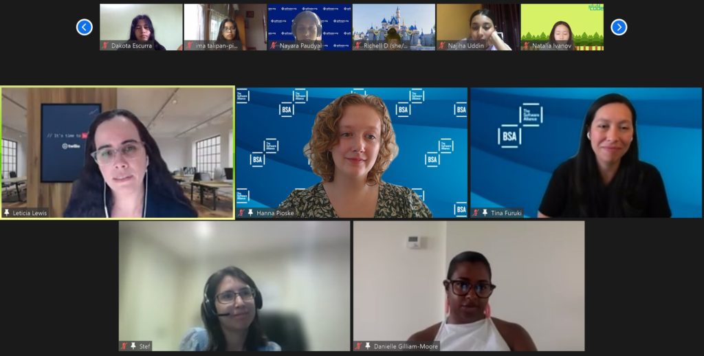 Our second workshop focused on the importance of mentorship, networking, and career building. We were joined by three panelists from Software.org— Stefania Durden, Tina Furuki, and Hanna Pioske—as well as Danielle Gilliam-Moore, Senior Manager, Global Public Policy at Salesforce and Leticia Lewis, Director, LATAM Public Policy at Twilio. Speakers gave students advice on using LinkedIn for networking, drafting a resume, as well as helpful pointers for their final projects.