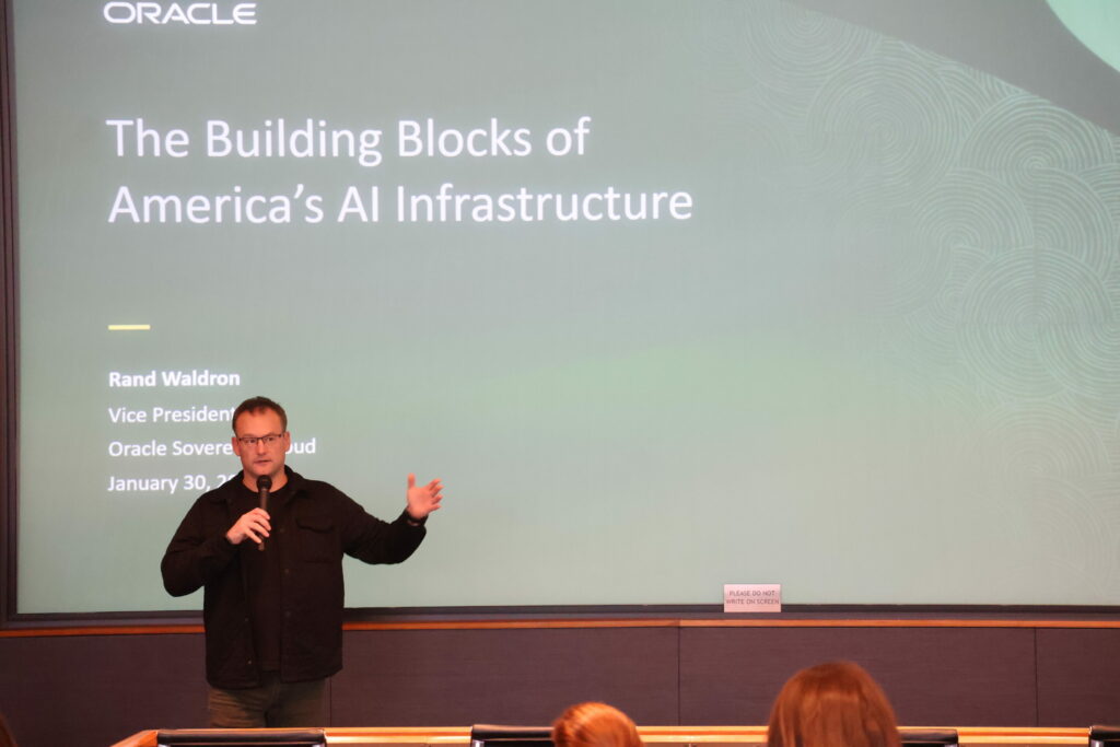 The session continued with a briefing from Rand Waldron, Oracle Vice President of Government, Defense, & Intelligence, who highlighted the infrastructure required to support AI and cloud adoption — in particular data centers — and how that infrastructure may evolve into the future.